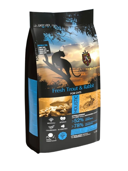 אמברוסיה פורל טרי וארנב - מזון יבש הוליסטי לחתולים פורמולה טבעית ללא דגנים, עם פורל וארנב טריים, ירקות, פירות ופרוביוטיקה. מותאם במיוחד לחתולים בוגרים, מעוקרים ומבוגרים – לשמירה על בריאות מיטבית ופרווה מבריקה.