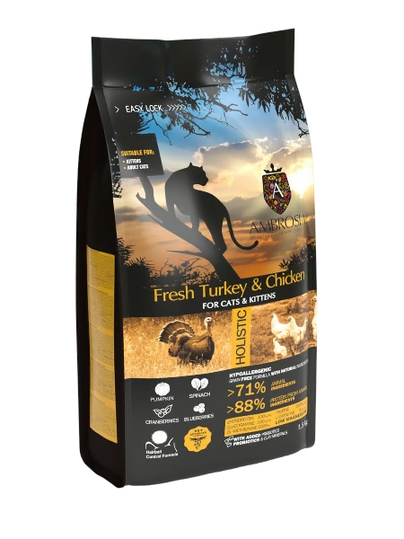 אמברוסיה הודו ועוף - מזון יבש הוליסטי לחתולים וחתלתולים 5 ק"ג Ambrosia Holistic Turkey & Chicken