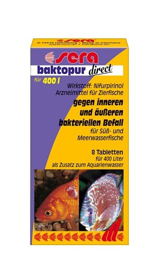 SERA Baktopur Direct מבית SERA הן טבליות טיפוליות ייעודיות למחלות חיידקיות באקווריומים מים מתוקים. התרופה מיועדת למצבים חריפים כגון דלקות חיצוניות, כיבים, פצעים פתוחים, ריקבון סנפירים ודלקות זיהומיות שונות.